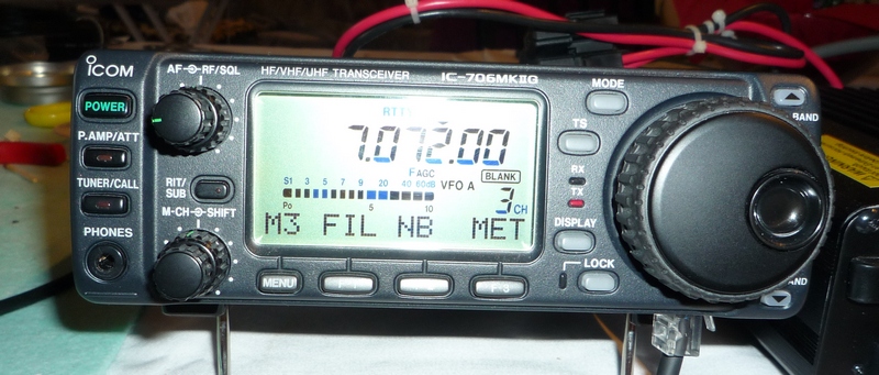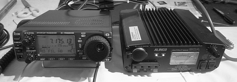 Pokud máme anténu vyvinutou, vyzkoušenou, vyladíme ji snadno jen s pomocí TRXu. Pro experiment jsem použil sestavu na obrázku, tj. rádio IC-706 MK2 se zdrojem: