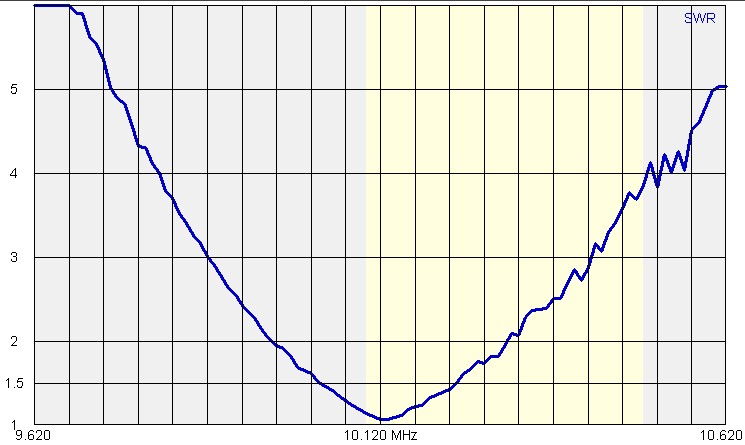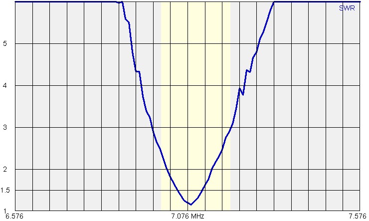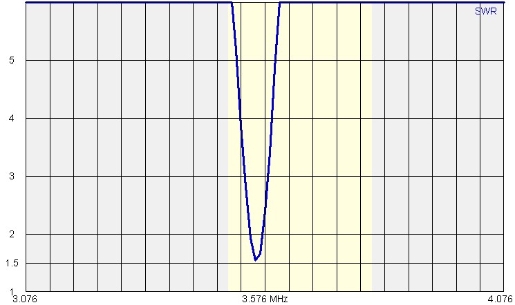 Rovněž si všimněte, že na pásmu 30 metrů je naladění poměrně široké (více než 200 kHz pro VSWR do 2), tak na pásmu 80 metrů je šířka pásma pro VSWR do 2 je cca 25 kHz - viz poslední diagram (vazba není optimální) a při dobře provedené vazbě naladění není širší než 50 kHz.