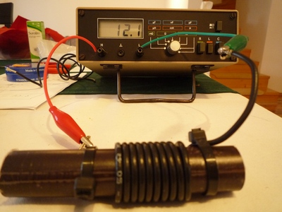 1. Na fotografii vidíte při měření nejkratší feritovou anténu (délka 100 mm). Vinutí je tvořeno 10 závity tenkého koaxiálu, použit byl jen plášť. Indukčnost takového vinutí je malá, cca 12 mikroH a nejde už vyladit pásmo 80m (Ladí asi od 4.5 MHz nahoru)