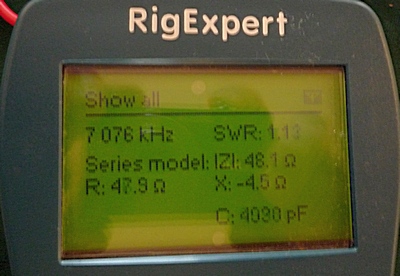 Hodnota R se zvýšila na téměř 50 Ohmů a výsledek vidíte na fotce vpravo. R je téměř 50 Ohmů (displej ukazuje 47.9) a VSWR kleslo na 1.13