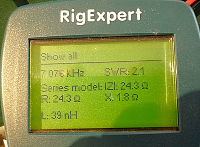 Při okraji tyče jsem přes rezonanční vinutí navinul 2 závity. Impedance, kterou jsem při rezonanci naměřil, měla vysokou hodnotu R (přes 200 Ohmů). Snížil jsem tedy vazební vinutí na pouhý jeden závit a naměřil jsem R = cca 25 Ohmů - viz fotka vpravo. To ještě není ono, VSWR by bylo kolem VSWR=2, takže jsem vazbu uvolnil tak, že jsem vazební vinutí dal pod okraj rezonančního vinutí.