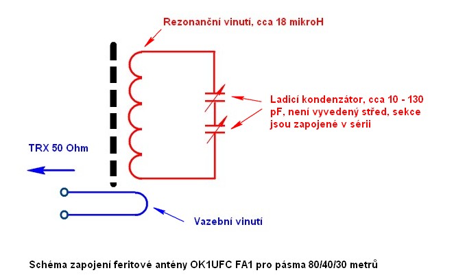 Stanovil jsem si drzý cíl, a to po zkušenostech s konstrukcí MLA antén - a sice napájet feritovou anténu přímo z TRXu pomocí koaxiálního napáječe se Z = 50 Ohmů. Protože jsem se vůbec neodvážil odhadnout ztráty v popisovaném rezonančním obvodu a pouze jsem odhadoval, že impedance paralelního rezonančního obvodu bude vysoká a impedance výstupu TRXu je 50 Ohmů, nastavoval jsem vazbu experimentálně.