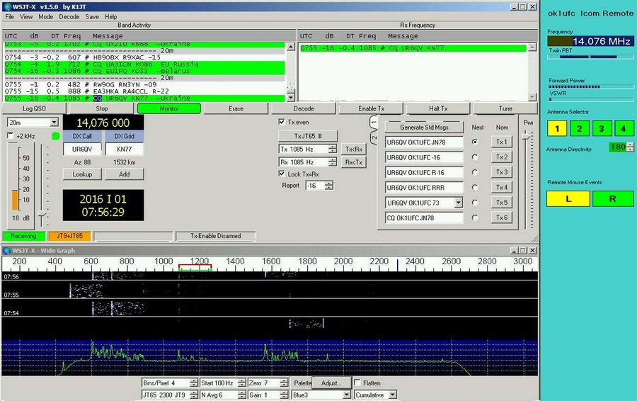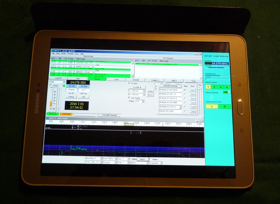 Vlevo jsou okna vzdáleně běžícího programu WSJT-W, který běží na řídícím PC Lenovo. Po této části, pokud jezdím prstem po dotykáči, nic se neděje, pouze se mění poloha kurzoru myši (nepodařilo se mi kurzor zachytit). V pravé části (odshora) se mi zobrazuje kmitočet rádia. Pod ním jsou řídítka pro TWIN PBT (šířka pásma Icom). Níže jsou bargrafy VSWR metru (P, VSWR). Mimo Icom mohu řídit ještě anténní přepínač (4 vstupy) a anténní rotátor směrovky (zatím jen azimuth).