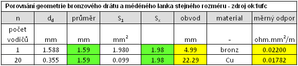 Na prvním řádku je uvedena geometrie jednoho drátu kruhového průřezu a na druhém řádku je uvedena geometrie lanka z 20 vodičů. Co vidíme v jednotlivých sloupcích zleva? V prvním sloupci je tedy počet vodičů lana, ve druhém sloupci je průměr jednoho drátu lana. V třetím sloupci je uveden vnější průměr, který je u obou typů vodiče přibližně stejný. V dalším sloupci je uveden průřez jediného vodiče v drátu/lanku. V pátém sloupci je uveden celkový průřez anténního vodiče. Obě hodnoty jsou stejné, zvýrazněné zelenou barvou. V šestém sloupci je vypočítána délka povrchu vodiče drátu a vodičů lana. Spočítejte si, že povrch lanka je asi 4.5 x větší, než povrch drátu. Velikost povrchu vodiče je důležitá. Víme, že u vedení HF proudů se uplatňuje tzv. skin efekt (povrchový jev). Vidíme, že lanko má 4.5 x větší povrch, který HF proudy vede. Pokud použijeme pro konstrukci antény rozdílných materiálů, tj. měděného lanka, které srovnáváme s bronzovým drátem, zjistíme, že měděné lanko je asi 5.5 x lepší vodič, než bronzový drát !!! A to jsem v úvaze nemusel pracovat ani s hloubkou vniku a zanedbal jsem jakost (hrubost) povrchu, která má také zásadní vliv.
