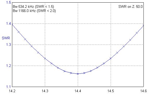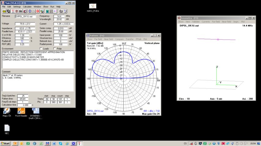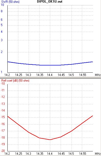 Zjistíme jednoduše rozdíly? V mnoha časopisech, na webu a konečně i v publikacích od G. J. Burkeho a Roye Lewallena zjistíme, kde mají jednotlivé softy svou Achillovu patu, tedy, kde nám modely již nedávají přesné či použitelné výsledky. O některých jsem psal dříve, o dalších také u konkrétních antén, které jsem modeloval. V žádném případě však nemohu přijmout tvrzení, které na webu také občas vidím. A sice, že modely se podstatně liší od reality. Skutečnost jsem nedávno dokazoval jednoduchým experimentem, a sice srovnáním dvou různých modelů (NEC-2 a MININEC) téhož geometrického prototypu a reálného měření na něm. Pro srovnání jsem použil jednoduchou anténu, dipól z AL trubky, který každý zná. Srovnání modelů a skutečné antény Vstupní podmínky: Byl vyroben dipól z hliníkových trubek o vnějším průměru 20mm. Ten byl vyvázán, aby se tolik neprohýbal a byl instalován na štíhlý stožárek přesně do výšky H = 12m ve známém QTH, tedy v mém QTH, kde jsem si nějak (o tom chci napsat zase jindy) stanovil dielektrickou konstantu a vodivost půdy. A přesně podle této antény, která měla nejlepší VSWR na kmiročtu 14.4 MHz byly vyrobeny dva modely, jeden pro MININEC a druhý pro NEC-2 (v programu 4NEC2). A na výstupu to vypadalo takto: Průběhy VSWR - první je NEC-2, SWR a (pod ním koeficient odrazu), následuje výstup z MMANA GAL:
