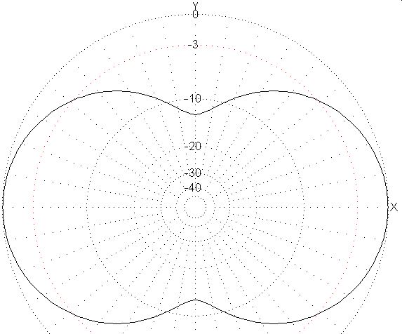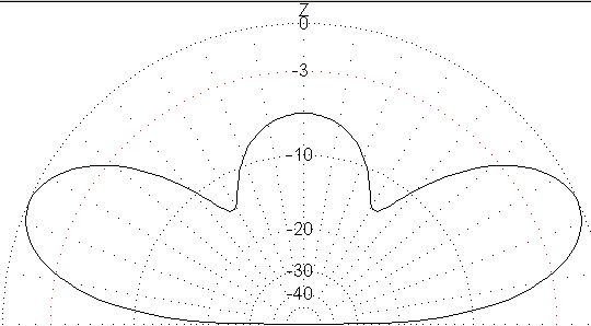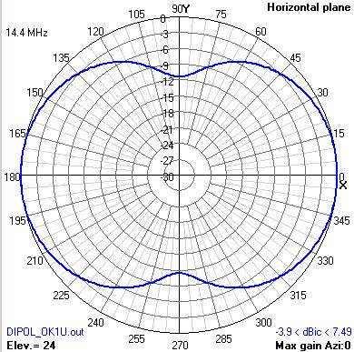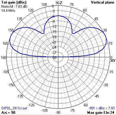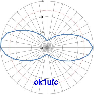 Všimněte si, že změřený obrazec má minimum, stejně, jako modely prosedlané asi o 12 až 13 dB, takže shoda. Všimněte si také, že skutečný model není symetrický. A tam se mi na tom podepsaly dvě příčiny. Jedna z nich je, že rotátor, který jsem měl, je již dost "ojetý" a má značné vůle. Bohužel, musel jsem měřit, když foukal vítr. Ta druhá je opravdu kovový sajrajt v elektromagnetické zóně antény. Vidíte, že po mnoha a mnoha zkušenostech si neodpustím upozornit, že u antén jsem se mimo mizerné účinnosti častěji setkával s hříchy v její směrovosti! Vyzařování ve vertkální rovině: Tady v této rovině neumím měřit, takže pouze výstupy z modelů NEC-2 a MININEC: