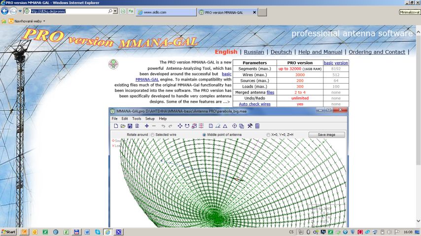 Všeobecně Od samého počátku jsem na těchto stránkách propagoval používání software pro modelování krátkovlnných antén. Mám pro to jeden zásadní důvod, který jsem získal mnoha zkušenostmi, hlavně experimenty s úspěšnými i neúspěšnými anténami. Experimenty s anténami nejsou levnou záležitostí. Jsou náročné na čas, materiál i znalosti. Modelování antén dokáže ušetřit mnoho času i mnoho materiálu. V dalším textu uvádím pár informací o tom, co je pro jednotlivce, klub či malou firmu, která se věnuje konstrukci antén dostupné. Software Pro modelování antén se nejčastěji používá tzv. NEC (Numeriacal Electromagnetics Code - Method of moments) - Nejnovější verze kódu NEC je NEC-4, který překonává většinu nedostatků v předchozích kódech. Tato verze umožňuje modelování podzemních radiálních systémů, použití prvků s různým průměrem a dalšího detailního rozmístěných paralelních vodičů všechny modelovací schopnosti starších verzí kódu. NEC-4 je proprietární kód laboratoře Lawrence Livermore National Laboratory a University of California, z nichž musí uživatel licence získat. Cena licencí za NEC-4 je asi 300 dolarů pro akademické nebo nekomerční použití, pro (neobčany US 500 babek) a asi 1100 USD pro komerční licence. (Přitlačili, musel jsem to tady přepsat.) Na stránkách institutu lze rovněž získat několik příruček, které popisují metodu NEC, včetně tzv. program description - CODE a uživatelské příručky - users guide, licenční ujednání, atd. Tady je odkaz: https://ipo.llnl.gov/data/assets/docs/nec.pdf V současné době nabízí na svých stránkách Roy Lewallen, W7EL program EZNEC Pro, který má možnost používat NEC-4, v případě, že máte zakoupenou licenci pro NEC-4. EZNEC Pro a EZNEC Plus jsou k dispozici také pro NEC-2 kód. Nejnovější W7EL NEC verze 5 jsou pro platformu Windows, jsou napsané ve Visual Basic 6. Bohužel, v demoverzi nelze téměř nic modelovat, ale postačí nám jako pomůcka k učení a pochopení, jak ovládat program EZNEC, jak si vyzkoušet zadávání dat modelů a generování výstupů. Nicméně, v demoverzi lze modelovat jen jednoduchý dipól, či dvouprvkovou anténu, protože je její funkcionalita omezena maximálně 20 segmenty a to je méně, než hračka pro děti. Nejlevnější placená verze (cca USD 100) toho také moc neumí (to jsou vyhozené peníze), takže aby tento program k něčemu byl, zaplatíte delší peníz, asi USD 250, a to za použitelnou verzi s NEC-2 enginem.. NEC-2 je použitelný kód, který není zpoplatněný. Je omezen na anténní prvky jednoho průměru (pokud nepoužijete korekční mechanismy softwaru). NEC-2 není až tak jednoduše použitelný na antény s radiály v zemi, nedává dobré výsledky ani u prvků, které svírají vájemně ostrý úhel. NEC-2 a NEC-4 je v podstatě kód, engine, jádro, kterému se zadávají v textové podobě vstupní data a rovněž výstupní data jsou textová. Prostředí, které vytvořil Roy Lewallen má k dispozici nástroje pro jednodušší zadávání dat, doplněné 3D grafikou a rovněž výstupy jsou obvykle grafické. Někde jsem se dočetl, že jeho Windows prostředí má asi 70 tisíc řádků programu, ale tuto informaci berte s rezervou. Podrobnosti jsou na: http://www.eznec.com/ Dalším použitelným programem (je zcela zdarma) pro enginy NEC-2 a NEC-4 je 4NEC2, jehož autorem je holanďan Arie Voors. Jde o hezkou aplikaci, která má vyřešený grafický editor vstupních dat. Rovněž jsou hezky vyřešené programy, které zpracovávají vypočtená data. Samozřejmě s grafickými výstupy. Neocenitelnou službu nám dělá rovněž optimalizátor. Optimalizátor nám umožňuje různým způsobem měnit celou řadu parametrů, provádět následně výpočet a porovnávat výsledek se stanovenými kritérii. V programech EZNEC, které jsem měl, jsem musel optimalizaci dělat ručně. Odkaz na stránky s programem je zde: http://www.qsl.net/4nec2/ A ještě pohled na obrazovku mého notebooku, kam jsem si ho také nainstaloval (otevřeno modelování dipólu, o kterém ještě bude v tomto pidičlánečku řeč):