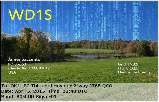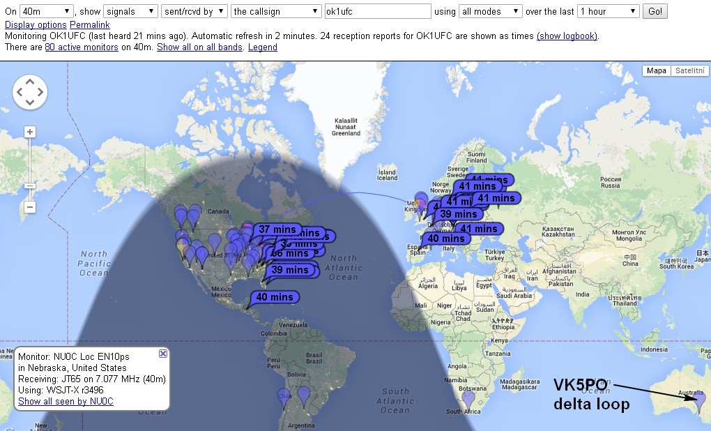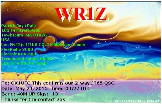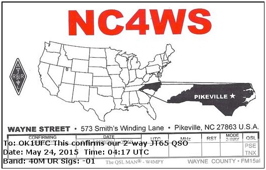24.5.2015 Obdržel jsem asi 2 dotazy mailem, proč jsem se věnoval hlavně zkouškám na 80m. Odpověď je prostá. Na pásmu 40 m (a taky 30 m) není nic zajímavého, ani srovnání s anténou GAP, ani srovnání se čtvrtvlnným vertikálem). Tam také anténa pokrývá celé pásmo a jsou pro mě zajímavé reporty protistanic. Nerad je publikuji, jsou ovlivněny vlastností QTH i použitými anténami protistanic. To platí i pro PSK reporter. Nicméně, dnes k ránu jsem dělal spojení s americkými stanicemi na 40 metrech s výkonem 40 Wattů. Nejhorší a nejlepší report byl -13dB/-01dB viz eqsl: