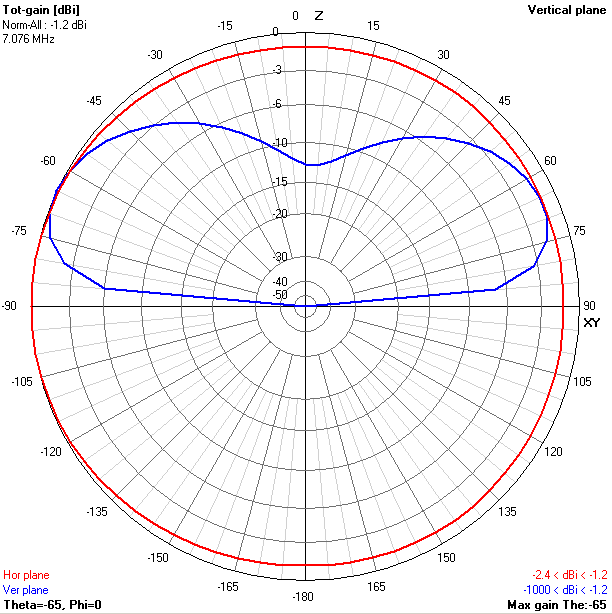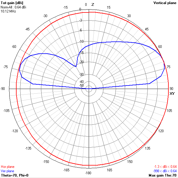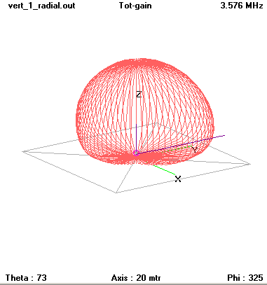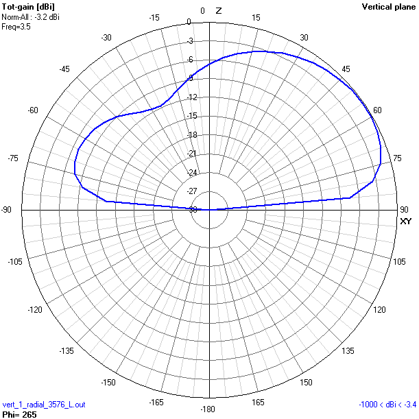 V průběhu letošního vývoje jsem opět zvažoval několik možností. V každém případě jsem uvažoval o protiváze tvořené jediným radiálem. Tato varianta by mi vyhovovala v maximální míře pro kompenzaci hlavně urbanistických vlastností mého QTH. Vertikální anténa s jedním radiálem vyzařuje např. takto: