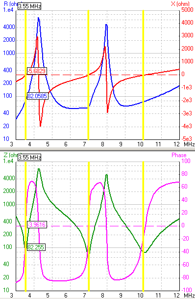 V horním diagramu je průběh reaktancí. Svislé žluté čáry odpovídají kmitočtům 3.576 MHz, 7.076 MHz a 10.120 MHz. Na těchto kmitočtech má anténa rezonanci.