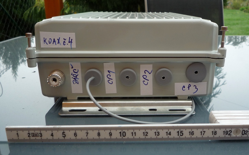 - v ALU boxu je konektor SO-239 pro připojení koaxiálu a 4 běžné plastové kabelové průchodky (vodič zářiče a výstupy 3 protivah CP1, CP2 a CP3)
