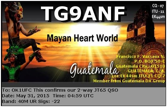 O anténě TG9ANF nic nevím. Jeho signály zde byly v neděli ráno 31.5.2015 silné. Můj výkon byl 10 Wattů, právě jsem zkoušel PSK reportér, viz text výše a dělal si několik spojení s 1 a 10 Watty na americký kontinet. VK2ZQ pracoval s vynikajícím vertikálem HF2V od Butternut a bylo to večerní spojení.