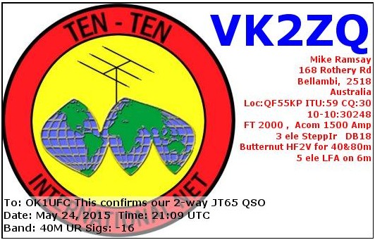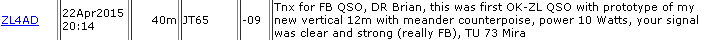 Přibližně ve stejnou dobu mi ZL1AD potvrdil -18/JT65, na 40 metrech anténa chodí jako normální slušný vertikál. Proto jsem jí zatím nevěnoval až tolik času.