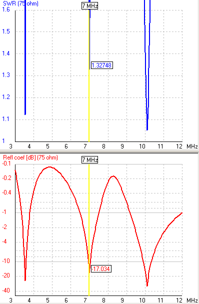 Průběh VSWR (impedance napáječe Z=50 Ohm, použití HF transformátoru) je na obrázku vpravo. Nahoře (horní graf vpravo) je průběh VSWR, pod ním průběh koeficientu odrazu, žlutá čára je na pracovním kmitočtu v pásmu 40m, tam bylo VSWR nejhorší, cca VSWR = 1.35. Anténa je tedy nastavená přesně do úzkých pracovních segmentů pásem a v těchto segmentech je velice dobře přizpůsobená.