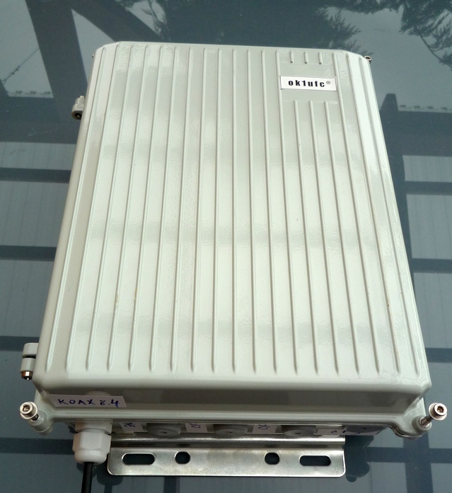 - Po uzemněné montáži aluboxu jsem byl nucen odstranit konektor a vyvedení koaxiálu udělat neuzemněné. V tomto okamžiku došlo k montáži běžné elektrikářské svorkovnice. Propojování napáječe s experimentálními baluny se stalo jednoduché.