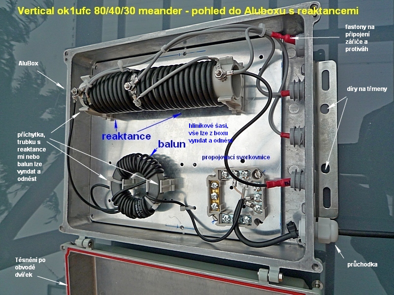 Na popisované anténě je box instalován na uzemněném sloupku od plotu, podel kterého jdou protiváhy a tak jsem ho musel vybavit pigtailem. Koaxiální kabel nesmí být spojen s kostrou aluboxu. Prostě to nefunguje a při příjmu slyším slabší rušení (rambajs) od trakce a sršících izolátorů vvn. Dal jsem si práci s jeho identifikací, ruší mi např. i do horizontálních dipólů nebo do G5RV. Rušení se však dá odstranit dobrou izolací napáječe od antény (nejen této). Pokud je anténa napájená na impedanci nízké (50 Ohm) a pokud je koax izolovaný, pak rušení zaniká a anténa je tichá. Proto bylo věnováno tolik péče balunům a HF trafům.