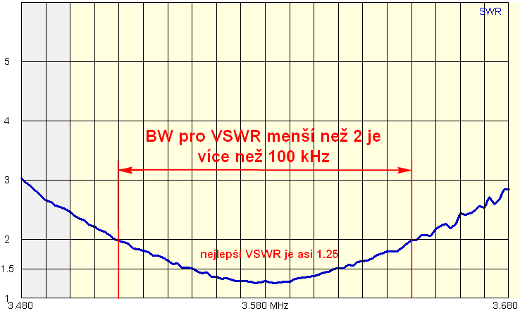 Opět si všimněte, že před stříháním je nejlepší VSWR mezi 3 450 - 3 500 kHz.
