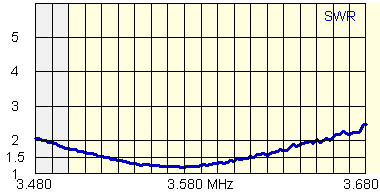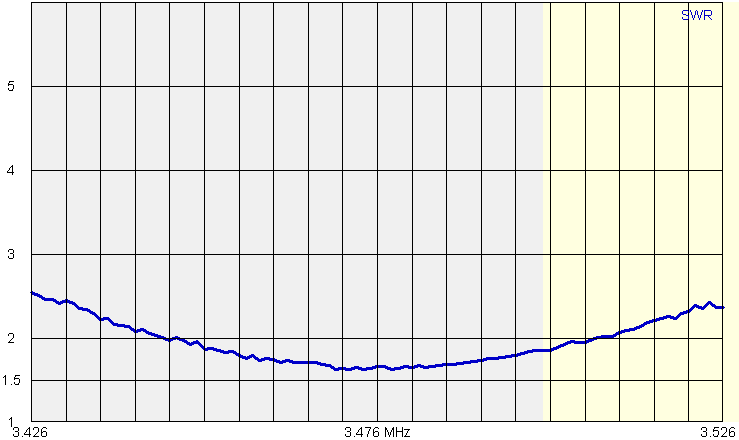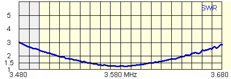 Typický průběh VSWR u nekrácené varianty vertikálu kolem kmitočtu naladění v pásmu 80 metrů po místní úpravě a doladění CP3 - viz obrázek vlevo.