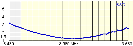 Dalším dnešním úkolem také bylo nalezení minimální výšky antény této koncepce, při které ji bude možné ještě používat na třech pásmech. Se zkracováním zářiče (asi na 9.5m délky) již klesá impedance na 3500 kHz, a to až na hodnotu kolem 30 Ohmů. To však již dosáhneme nejlepší hodnoty VSWR jen kolem VSWR = 1.5 v rezonanci a na koncích 100 kHz pásma je VSWR = 2.5. Zkrácení drátu zářiče na cca 9.5 m znamená zásadní snížení výšky teleskopu o dva horní díly, případně možnost použití menšího teleskopu. Smutné je, že takto zkrácená anténa se mi při příjmu a ani při vysílání nejevila horší, než ta dlouhá, ale přece jenom mám rád dobré VSWR. Škoda. Pro ilustraci informací z textu uvádím na obrázku vpravo průběh měřeného VSWR před laděním CP3.