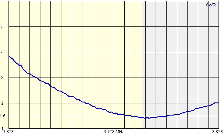 Impedance, kterou jsem měřil na kratičkém pigtailu (přímo u aluboxu) byla o něco více, než R=33+j0, takže VSWR se pohybovalo mírně pod hodnotou 1.5 a to už je na hraně ponechat proudový balun 1:1 nebo použít HF trafo. Viz příklad z měření kolem 3.8 MHz vpravo. Nicméně, tak i tak lze anténu používat a lze ji s touto hodnotou VSWR naladit do jakékoliv části pásma.