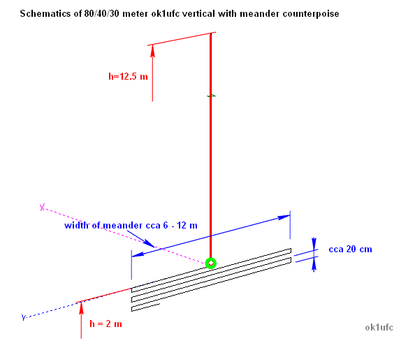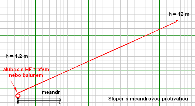 Ještě jsem se zamyslel, zda bych ve stálém QTH stavěl pouze jednopásmový vertikál s 12.5 metrovým teleskopem. Asi nikoliv. Stejnou službu by mi udělal drátový šikmý sloper. Sice by mě více obtěžovaly kontinentální stanice svými silnými signály, ale měl bych mezi nimi slyšet tytéž DX stanice, které slyším na vertikál. Dnešní SDR rádia jsou mnohem odolnější než můj Kenwood nebo Icom a tak bych mohl využít skutečnosti, že pásmo 80 metrů je kouzelné tím, že tam jsou slyšet místní stanice i protinožci. Zmíním se tu však jen o srovnání sloperu a vertikálu z pohledu vyzařování a uvedu schéma sloperu s meandrovou protiváhou: