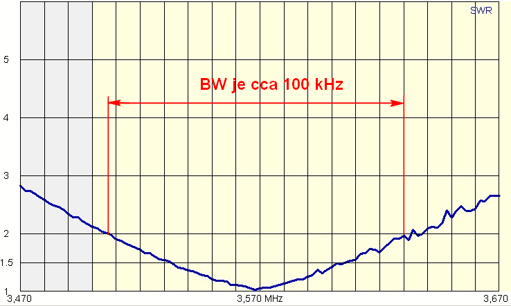 Při prvním měření, před stříháním, kdy jsou vodiče nezkrácené, musíme nalézt rezonanci mezi kmitočty 3 450 až 3 500 kHz. Rovněž šířka pásma pro VSWR menší než 2 bude asi 100 kHz.