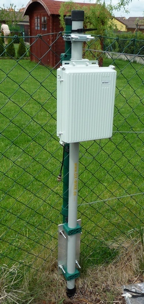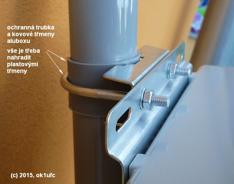 - Alubox s balunem (nebo HF trafem) a reaktancemi. Po odpojení vodičů a odšroubování třmenů ho lze odnést, kouká z něho jen pigtail (asi 15 cm) s konektorem SO-239. Já box nemám na laminát. tyči (čtěte však dále), ale u tohoto prototypu na sloupku od plotu, který je hned vedle zabetonované patky.