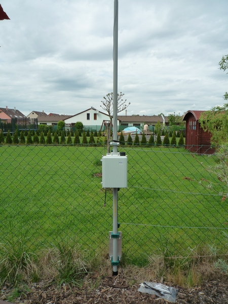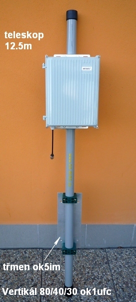 Konstrukce zářiče: měděné lano navinuté na laminátovém teleskopu výšky 12.5 m, instalovaného na nízkou zabetonovanou trubku pomocí standardní patky od výrobce OK5IM. Jirka již několik let vyrábí celou řadu standardních součástí pro konstrukci antén. Tyto součásti jsou běžně dostupné a nemá smysl ztrácet čas jejich vývojem.