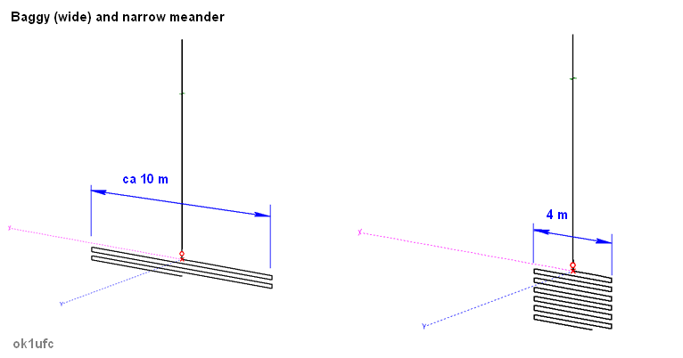 Pro uvedená pásma je dobré, aby vzdálenost vodičů meandru byla alespoň 20 cm. Lepší účinnost mají antény s širším meandrem, antény s úzkým meandrem byly však méně hlučné: