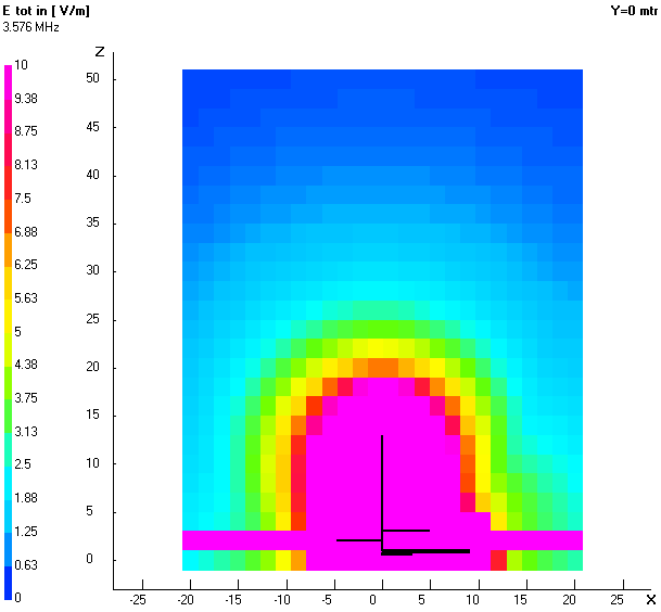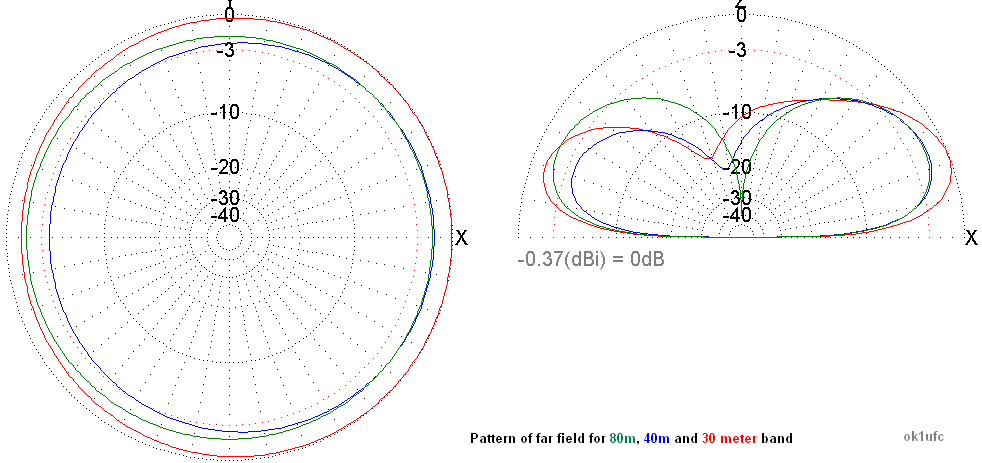 2. Z půlvlnné antény podstatným způsoben vyzařuje pouze svislá část antény. Ta je dlouhá právě 10 metrů, a to na každém pásmu a vrchol má ve výšce kolem 12.5 m a je to dáno výškou použitého teleskopu. To platí pro každé z pásem 80/40/30 m. Zbývající délky vodičů jsou pouze reaktancemi, včetně kapacit vůči zemi.