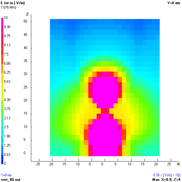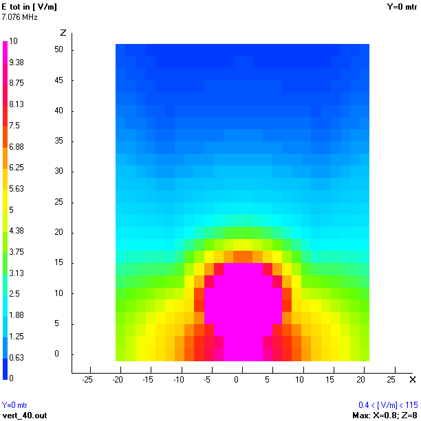 Všimněte si, že značná intenzita pole (V/m) je u této antény od nulových výšek a v nízkých výškách směrem k horizontu.