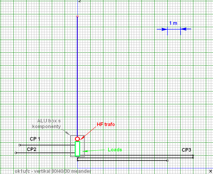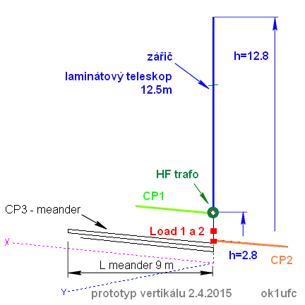 Proč zde píšu o prototypu č. 1? Tato anténa nemá žádný přepínač pásem a je vyžadováno vynikající přizpůsobení. Aby byly reaktance Load 1 a Load 2 snadno realizovatelné, byla jasná opakovatelnost jejich výroby bez nastavování, přesunulo se nám několik požadavků na geometrické rozměry na rozměry CP1, CP2 a CP3 (teleskop a stožár jsou u antény konstantami). Nepříjemností je, že kvůli vzájemné impedanci protivah a jejich poloze velmi nízko nad zemí se zkomplikoval návrh antény v několika věcech: