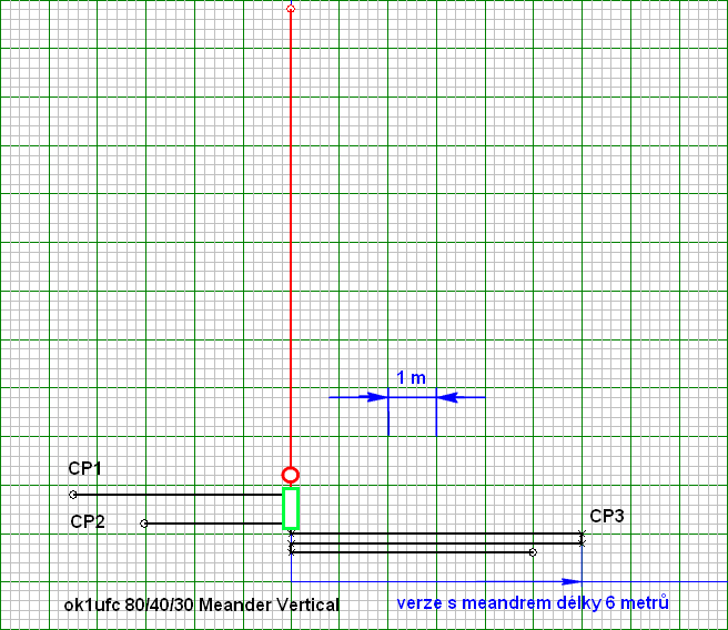 První prototyp č. 1 byl zhotoven podle schématu na obrázku vlevo. Protiváhy CP1 a CP2 nejsou meandrové. Jsou orientované podle schématu. Jejich délka se pohybuje od cca 4 do 5 metrů (každá). Protiváhou CP1 se nastavuje přesně rezonance na kmitočtu 10120 kHz. Protiváhou CP 2 se nastavuje přesně rezonance na kmitočtu 7076 kHz. CP3 má tvar meandru a jejím volným koncem se nastavuje rezonance na kmitočtu 3.576 kHz. V pásmech 80/40/30 metrů lze samozřejmě nastavit libovolný kmitočet, ale anténa je úzkopásmová, tj. předem navržená a určená pro práci v úzkém pásmu kmitočtů.