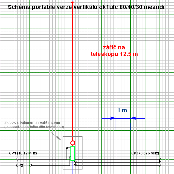 Schéma finálního provedení portable varianty vertikálu (s aluboxem na teleskopu). Všechny protiváhy se u této verze přestěhovaly "nízko" nad zem, asi jen do 1m výšky. Alubox je na spodním dílu teleskopu - viz foto.