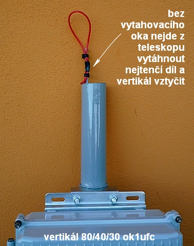 Na první fotce je vertikál ve složeném stavu, ale s namontovaným aluboxem a patou vertikálu ok5im (bez třmenů). K montáži aluboxu jsem použil zatím pouze třmeny a ochranné trubky na teleskopu. Vypadá to neprofesionálně, tj. dost blbě a tak jsem se na Jirku, ok5im, obrátil, zda by byl ochotný dodat s patou také dva další třmeny na alubox. Pokud je teleskop ve svislé poloze, tak je nemožné vytáhnout nejtenčí díl. Musí na něm být armatura s vytahovacím lankem, páskem nebo něčím podobným. Provizorně tam mám vytahovací lanko přidělané stahovacím páskem. Vím, že to není moc pěkné, ale dneska jsem s tím nic nenadělal.