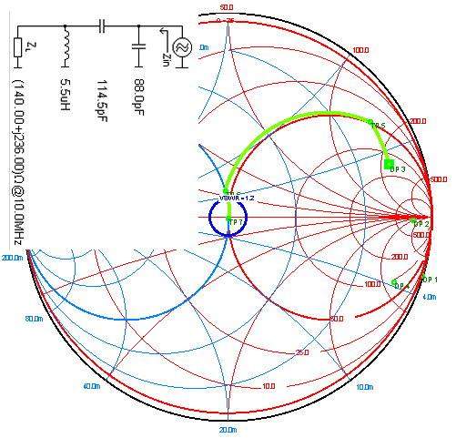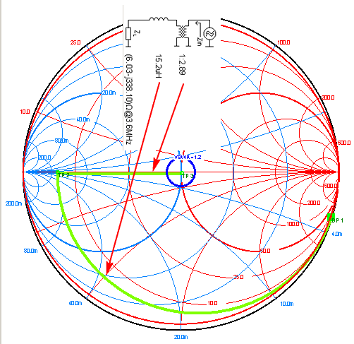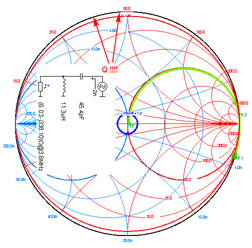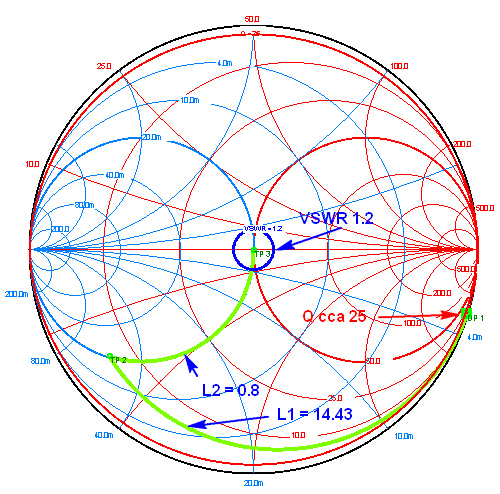 ohraničuje VSWR = 1.2 a poblíž obvodu jsou rozsvíceny oblouky s Q =