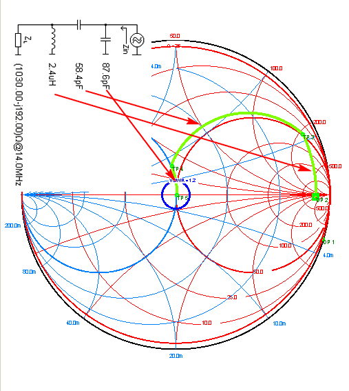 = 0.8 mikroH, vše zobrazují zelené kružnice, L2 končí ve středu