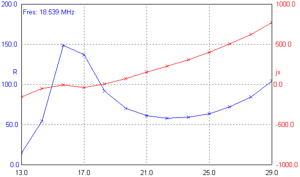 Anténa má zvolenou výšku tak, aby se maximální hodnota R nacházela někde mezi pásmem 14 a 18 MHz. Směrem k nízkým kmitočtům (14 MHz) nám R klesá pod hodnotu 50 Ohmů. V mém případě bylo na pásmu 18 MHz R vysoké. Jalovou složku lze vyladit kapacitou gamma matche. Příklad vyladění na pásmu 18 MHz je vidět na tomto obrázku. Všimněte si, že jX se nám plazí kolem nulové hodnoty. S jediným kondenzátorem však jX vyladíte na všech amatérských pásmech.