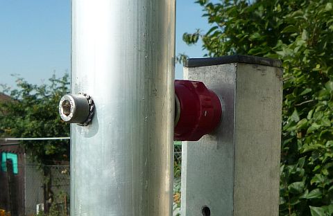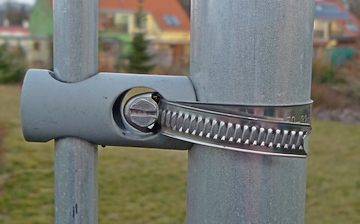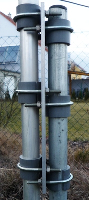 Štíhlá anténa se montuje na nízký stožár (do 1m) buď pomocí třmenů a izolačních trubek nebo pomocí distančních kompozitních izolátorů. Obě varianty jsou rovnocenné. Používám obě, preferuji tu pravou, protože po vytočení jednoho šroubu lze anténu sklopit třeba při silném větru nebo když potřebuji něco udělat v boxu. To u varianty vlevo nejde tak snadno ...
