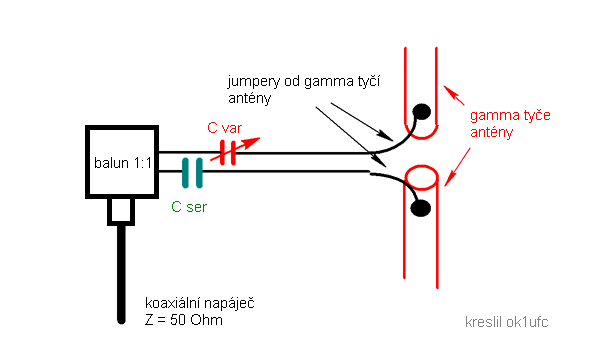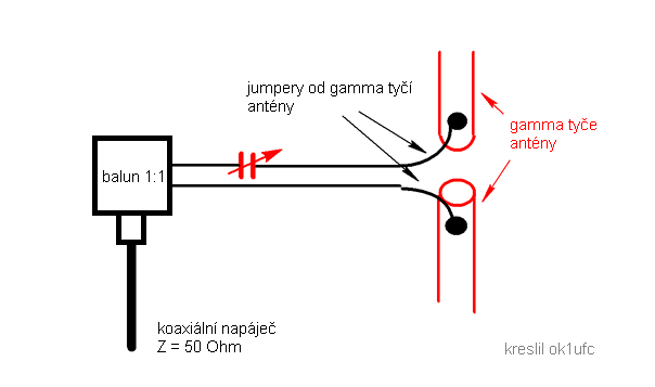U konstrukce balkónové je jen jeden balun. Koaxiál jsem nevedl skrz trubku, ale přímo od plastového boxu. Pro vyladění na všech pásmech stačí jediný kondenzátor - viz červená značka na schématu. Kondenzátor a balun jsem vyvedl na svorky boxu. Svorky jsou propojené s gama tyčemi jumperem. U kondenzátoru je důležitá jeho minimální kapacita, která byla v mém případě asi 7 pF (pásmo 28 MHz). Maximální kapacita byla asi 35 pF (pásmo 14 MHz).