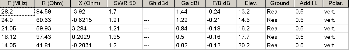 Anténa byla poměrně dobře přizpůsobená na všech pásmech. Přizpůsobení lze snadno modelovat a lze také snadno nastavovat. Modelovat se vyplatí v případě, že se nám zadaří vyrobit anténu s jinými hodnotami R. Ty lze většinou doladit jumpery, které propojují zářič Z2 s gamma tyčí bočníku. Proti hodnotám v tabulce by se dal najít i kompromis mezi hodnotami pro pásmo 14 a 18 MHz. Já jsem preferoval nízké VSWR na 20m. Na 17m jsem dosáhl hodnoty lepší, než u modelu, VSWR bylo cca 1.5 ...