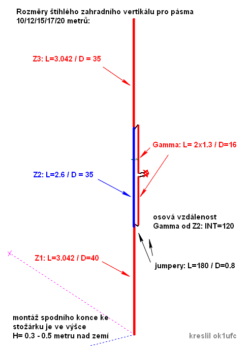 Vlevo je štíhlý vertikál, vpravo je balkónový vertikál. Na gamma match jsem použil AL trubky o průměru 16 mm. Do osové vzdálenosti 120 mm jsem je dostal pomocí 2ks distančních plastových trubek montovaných pomocí nerezové hadicové stahovací spony. Gamma match tyč se překrývá s částí zářiče, kterou jsem označil jako Z2. Propojení gamma tyčí se zářičem je pomocí Cu jumperů délky cca 180 mm. Výpočtově jsem stanovil o něco větší délku, kdyby bylo třeba ladit. Stejné jumpery vedou k boxu s balunem a ladicím kondenzátorem.