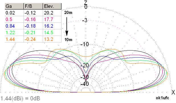 Protože není okolí zářiče zaneřáděno ve svém okolí dalšími různě rezonujícími vodiči, není ani deformována vyzařovací charakteristika a anténa rovněž neobsahuje dlouhé zářiče, které by nám způsobovaly vyzařování horními laloky. Anténa vyzařuje takto: