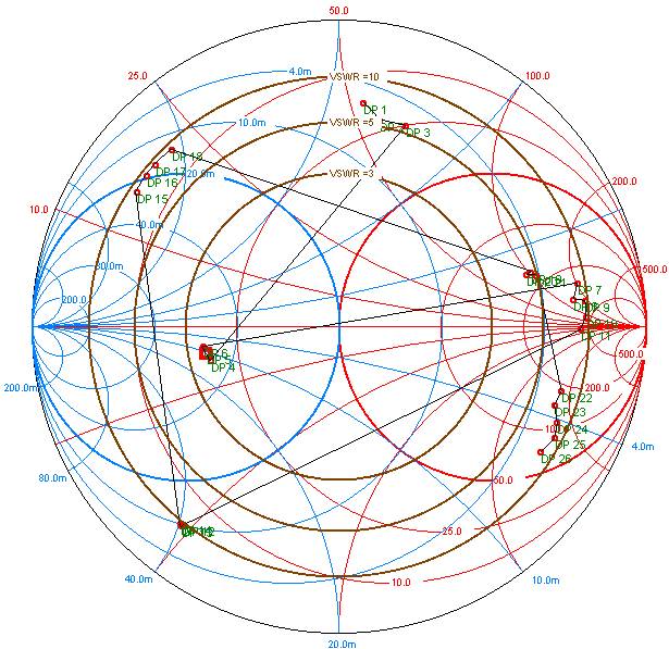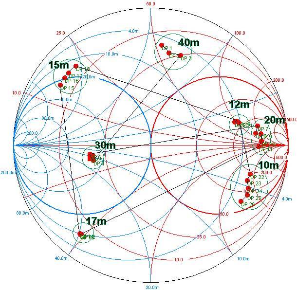 jsou zakreslené kružnice s VSWR=3 (nejblíže středu) a poblíž jsou body pro pásmo 30 metrů. Dále je zakreslena kružnice VSWR=5 a VSWR=10. Zpravidla naměříte všechny impedance na pásmech od 40 do 10 metrů mezi těmito kružnicemi a VSWR na žádném pásmu není vyšší než VSWR=10.