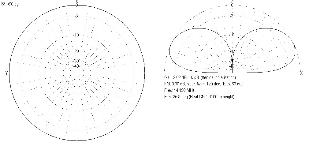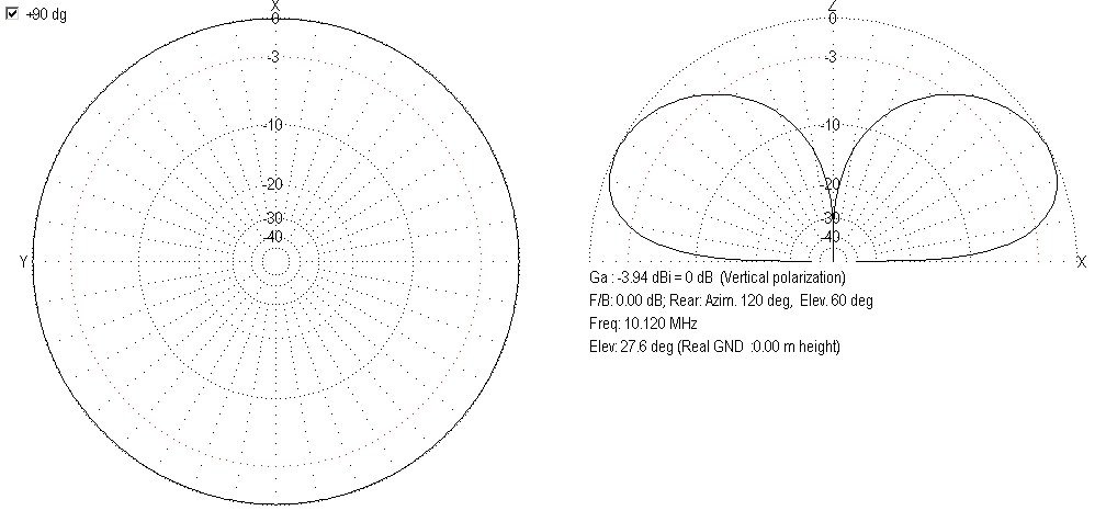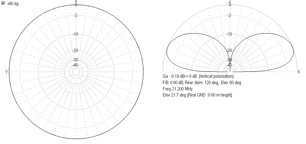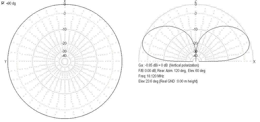 I další pásma mají diagramy správné, na 12 metrech již nám při nulové výšce nevystrkují růžky horní laloky zářiče, jako tomu bylo na 10m, v horizontální rovině je anténa všesměrová, ve vertikální rovině má nízké úhly. Model a uvedené zisky odpovídají realitě při hodnotě uzemnění měřené na kolíku R= asi 40 Ohmů ....