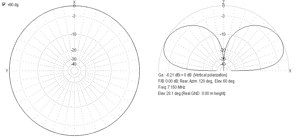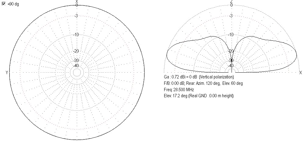 Vyzařovací úhly jsou u modifikovaného Rybakova "správné" na všech pásmech, začínám na 28 MHz. Vyladíte sice i na 6 m, ale svítíte pánu bohu do oken, tam už to vyzařuje laloky vzhůru, ale na 28 MHz to má nádherné úhly (17.2°):