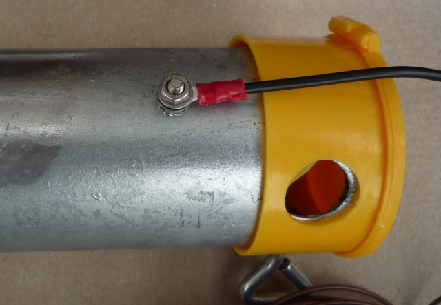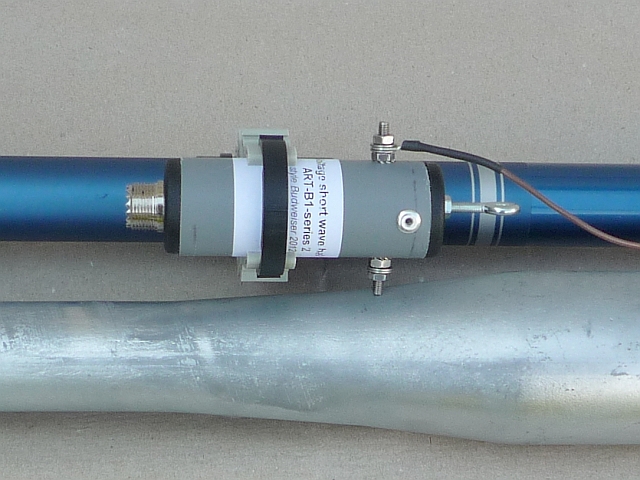 Detail pouzdra transformačního balunu (v provedení model 2011, v roce 2012 dodávána serie 2 mini), na detailu je vidět propojení (černý vodič) s patou, která slouží jako zemnicí kolík: