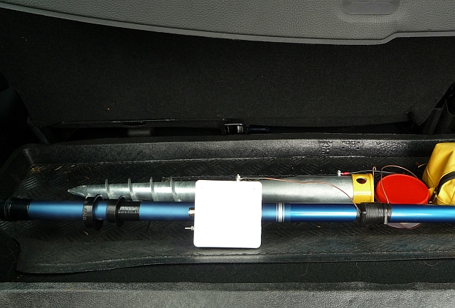 Takže co k tomu dodat? Vytáhneme z kufru, zatočíme kolík do země (vratidlo je uvnitř), navineme drát na teleskop, zasadíme do paty, zajistíme šroubem, propojíme, připojíme koaxiál a jedem. Přeji hodně pěkných DXů z pláží či z kempů ....