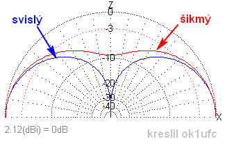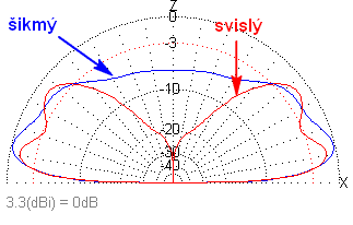 4. Na obrázku vpravo vidíte vyzařování vertikálního dipólu nad perfektní zemí (červená čára). Všimněte si výrazných minim. Modrá čára ukazuje vyzařování šikmého dipólu. Vidíte, že minima nejsou nekonečná, ale jsou menší než 10 dB. Proč o tom píšu? Všimněte si, jak jsem v předchozím textu napsal, že vlastně nevím, jaká je správná elevace pro konkrétní DX spojení. Vím však, že minima ve vyzařování ve svislé rovině jsou nepříjemná a mohou nám realizaci tolik touženého spojení naprosto znemožnit. Zatímco o vyzařování a směrovosti antén v horizontální rovině, myslím, nemá dostupná literatura a články na Internetu příliš dluhů, netvrdím toto o vyzařování antén ve vertikální rovině. Všiml jsem si mnoha často až zavádějících nebo dokonce nesmyslných informací o takovém vyzařování. Přitom je však pravdou, že stačí použít jen několika málo kroků a máme o tom jasno. Pokut mám zevšeobecnit, ppak snad prostým konstatováním, že sidelobes pro konkrétní výšku antény a také pro efektivní délku zářičů je třeba řešit.