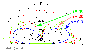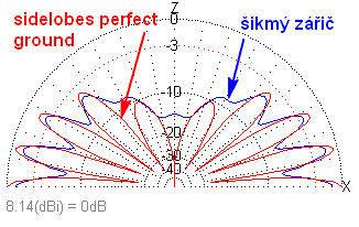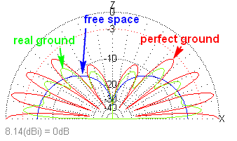 3. Všudypřítomná zem nám způsobuje skutečnost, že anténa vyzařuje tzv. horními postranními laloky (sidelobes). S ohledem na délku vlny však nemá téměř nikdo možnost takové vyzařování měřit. Lze ho však velice snadno modelovat. V programech NEC k tomu použijeme režim Perfect ground.